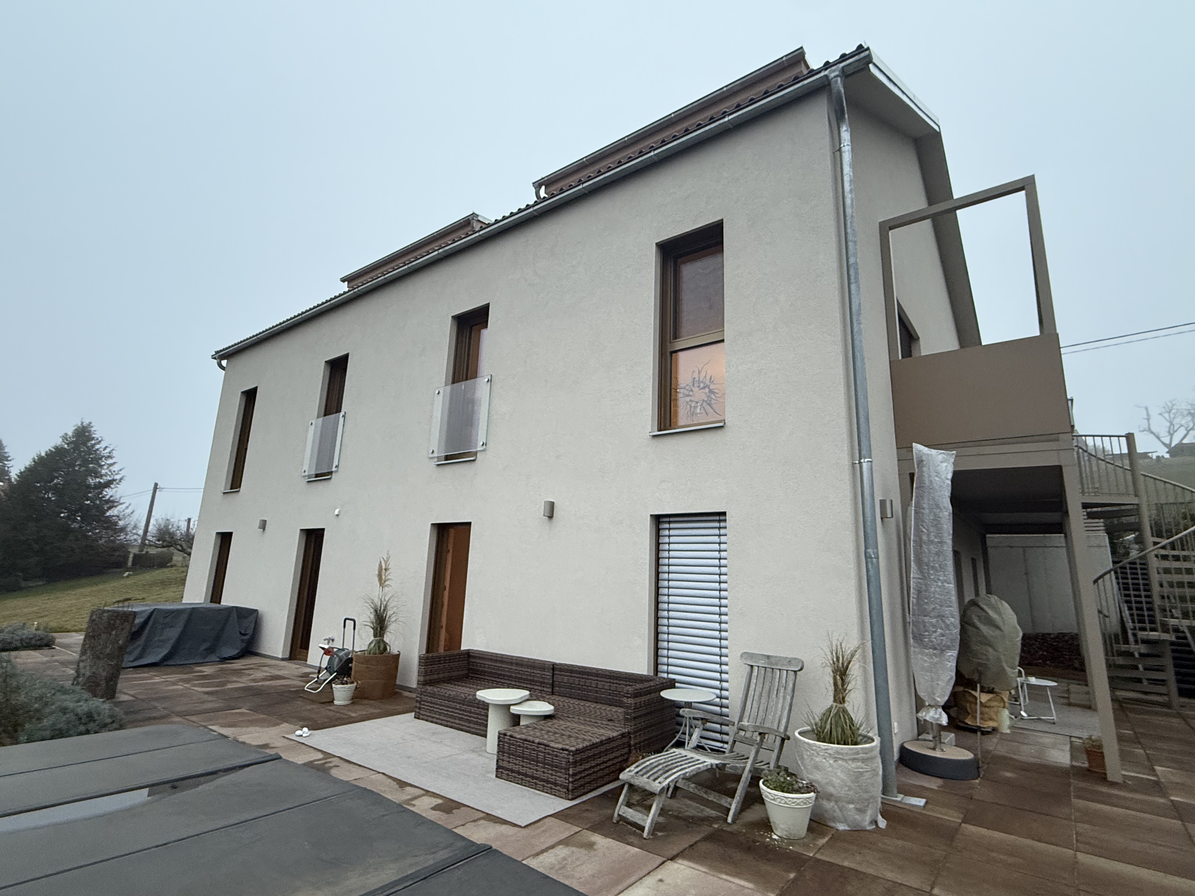 Zwei Doppelhaushälften (ca. 278 m² Wohnfläche, ca. 800 m² Grund) mit unverbaubarem Blick auf den Schöckl, erbaut 2023. Flexibel nutzbar: Aktuell ein großzügiges Einfamilienhaus mit integrierter Gästewohnung – optional als zwei separate Doppelhäuser oder mit unabhängiger Einliegerwohnung im Osten teilbar. Hochwertig ausgestattet mit Wärmepumpe, Fußbodenheizung, Klimaanlage, EWE-Küche, Premium-Bäder und Swim-Spa im Garten. Alle Zimmer mit direktem Zugang ins terrassenförmige Gartengelände.